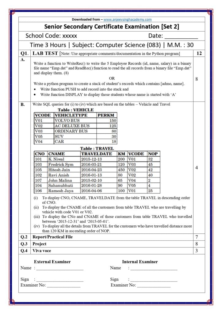 Class 12 Computer Science (083) — Practical Examination Question Paper Set 2 with Answer Key (Download PDF)