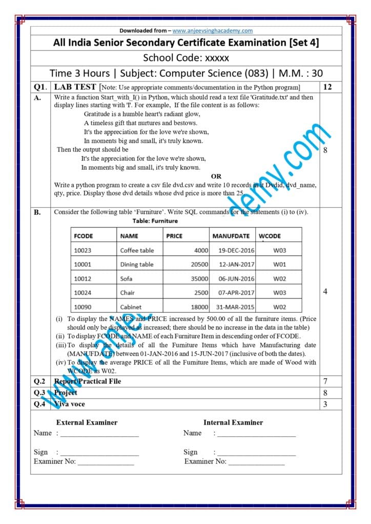 Class 12 Computer Science (083) — Practical Examination Question Paper Set 4 with Answer Key (Download PDF)