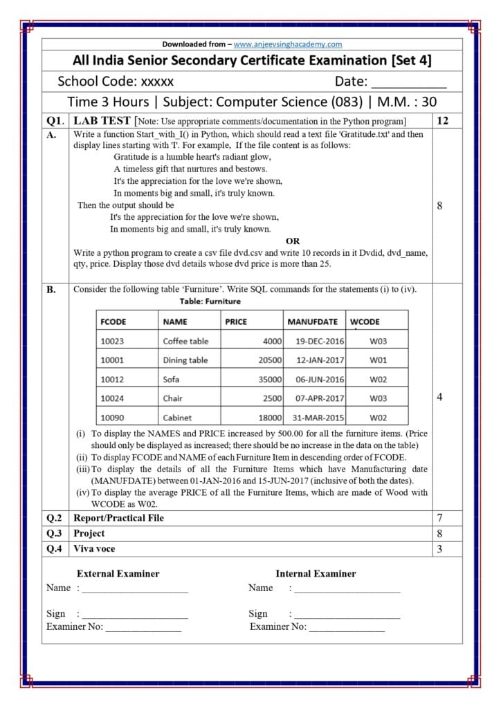 Class 12 Computer Science (083) — Practical Examination Question Paper Set 4 with Answer Key (Download PDF)