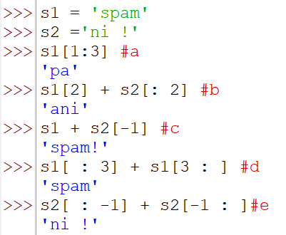 Que 10. Considering the same strings s1 and s2 of question 5 above, evaluate the following expressons: (a) s1[1:3] (b) s1[2] + s2[: 2] (c) s1 + s2[-1] (d) s1[ : 3] + s1[3 : ] (e) s2[ : -1] + s2[-1 : ]