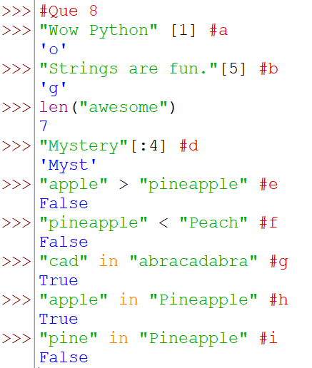 Que 8. What will be the result of following expressions? (a) “Wow Python” [1] (b) “Strings are fun.”[5] (c) len(“awesome”) (d) “Mystery”[:4] (e) “apple” > “pineapple” (f) “pineapple” < “Peach” (g) “cad” in “abracadabra” (h) “apple” in “Pineapple” (i) “pine” in “Pineapple”