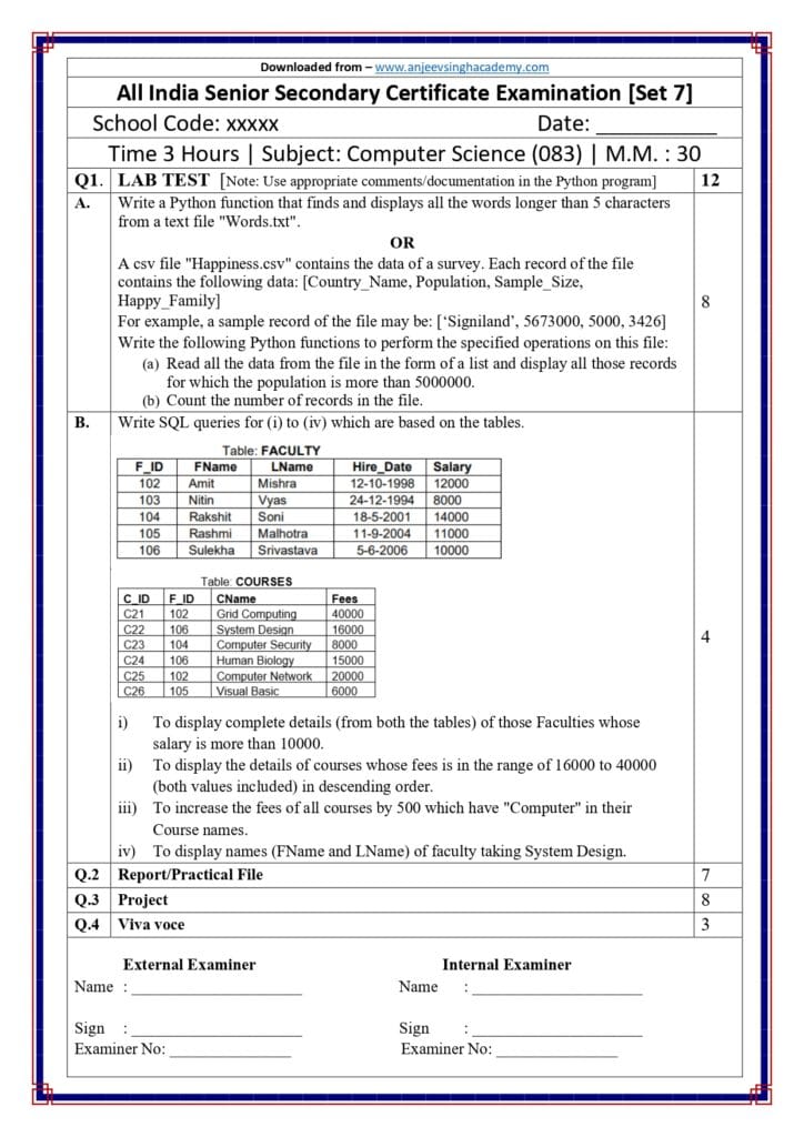 Class 12 Computer Science (083) — Practical Examination Question Paper Set 7 with Answer Key (Download PDF)